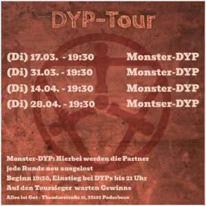 Die DYP Tour (draw-your-partner)! Mitspieler werden in jeder Runde zugelost. Teilnahme ist unabhängig von der Stadtliga, mitmachen kann jeder. Auch Anfänger sind herzlich willkommen und gern gesehen!